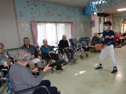 その後は、利用者のみんなを敬老の日で楽しんでいただく目的で、「平成ジャパン」の野球選手によるキャッチボールの披露やバントの指導を受けました。若かりし頃、野球部だった車椅子の男性利用者がおり、バントをした姿も現役の選手のようでした。